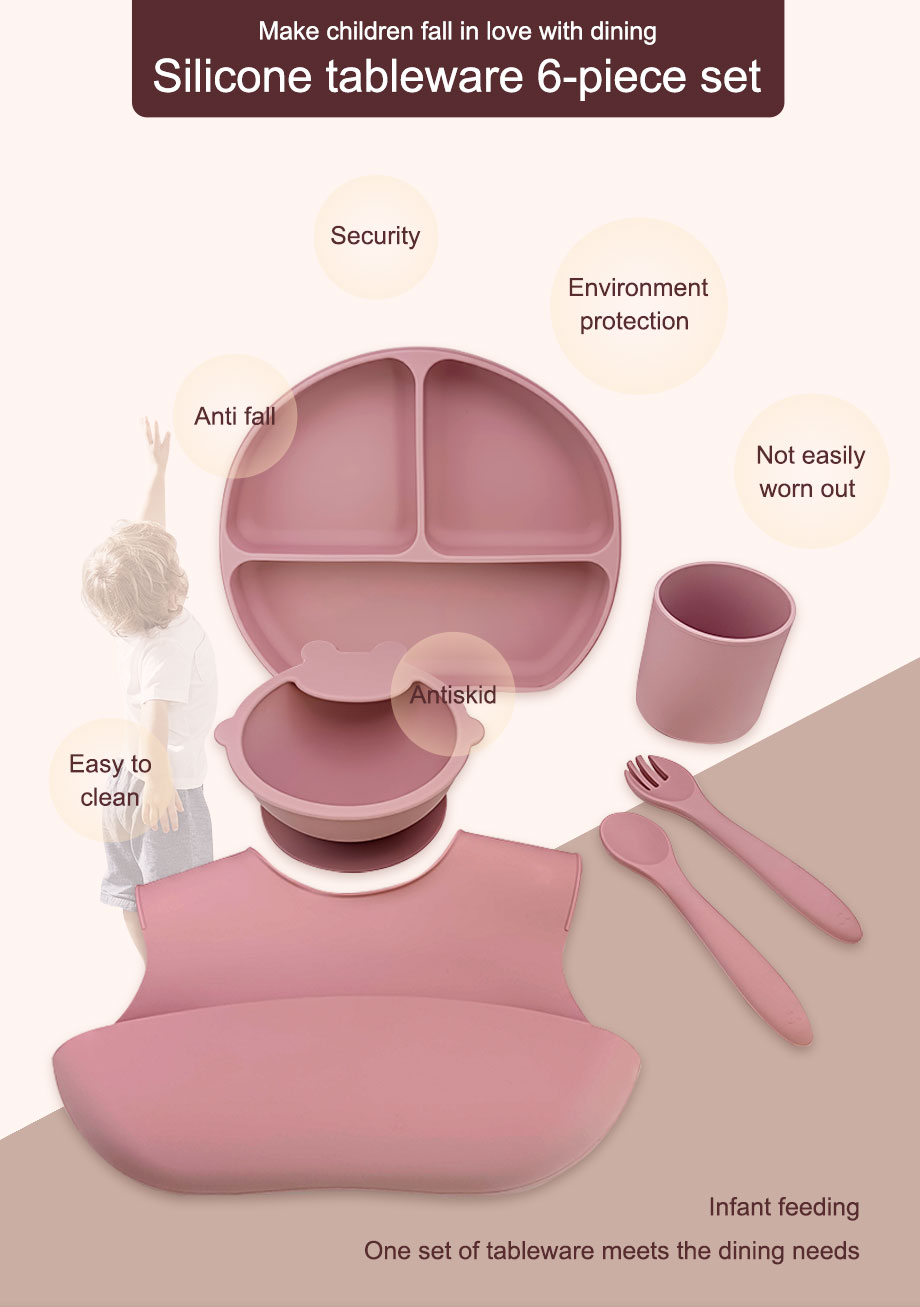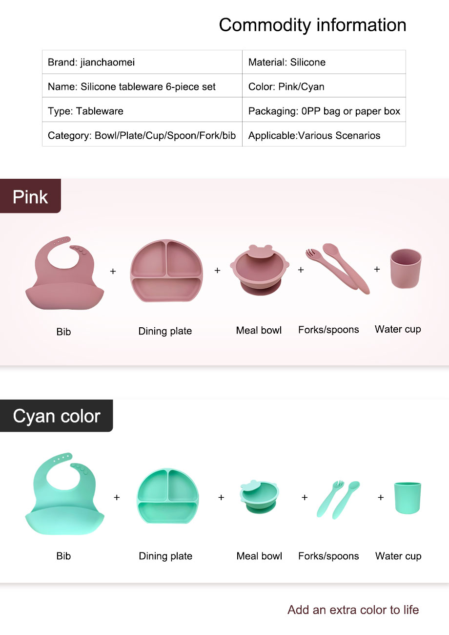 The quantity of this product is 6 pieces, mainly distributed as plates, bowls, cups, spoons, forks, bibs, and a set of tableware can meet the dining needs of children over 6 months old.