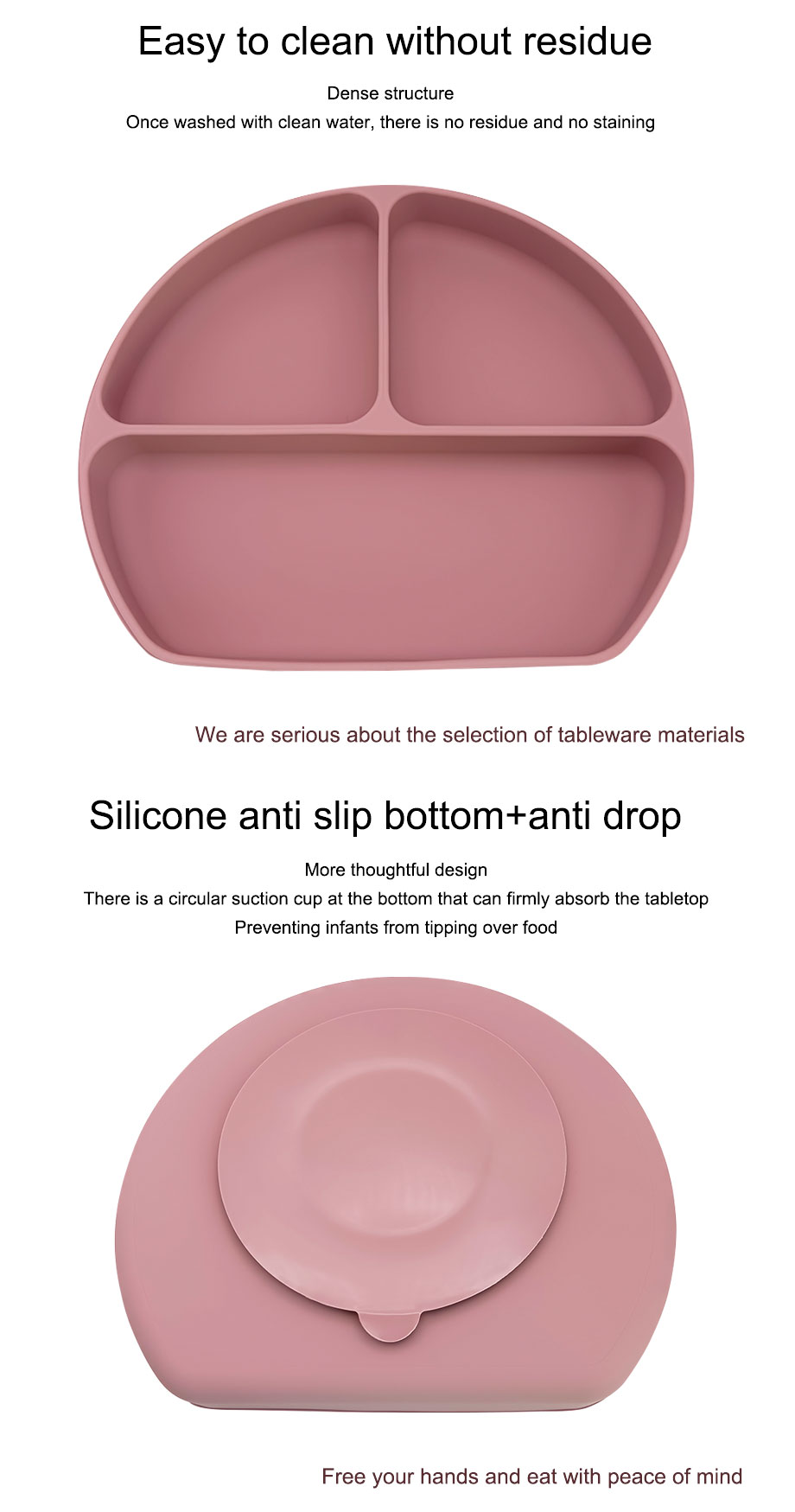·A more thoughtful design, both the plate and bowl have anti slip bottoms with anti drop function. The circular suction cups at the bottom can firmly absorb the tabletop, preventing babies from tipping over food.
